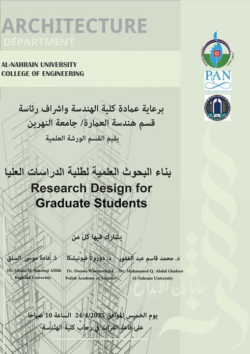 On 24 April 2025, Dr Dorota Woroniecka-Krzyzanowska and Prof. Ghada Al-Slik led a workshop “Research Design for Graduate Students” at the Department of Architecture, Nahrain University. The workshop focused on the development of practical skills in the field of research design through direct application of theoretical concepts and methodological tools on chosen case studies. The workshop was attended by graduate students and staff of the Department and involved several team exercises. The team thanks Dr Haitham Al-Shamari and Prof. Mohammad Qasim Ghafoor for organization of the workshop and the students for their energy and engagement with the topic.